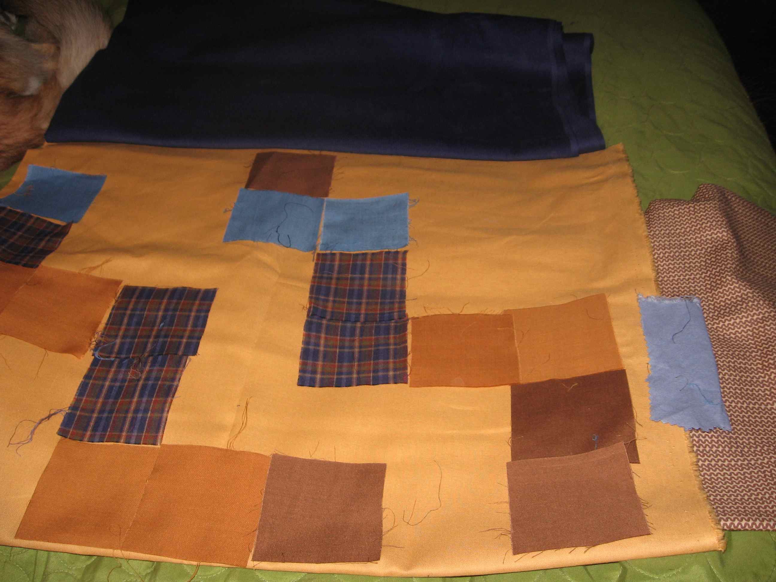 The 3x3 blocks were cut by my mom from scrap fabric and old clothing back in the late 70s and 80s. The lighter brown color is from an old shirt of my dad's. The plaid was leftovers from a shirt I made in high school. Not sure what the blue and dark brown are from, although the dark brown certainly could be from another of dad's shirts.