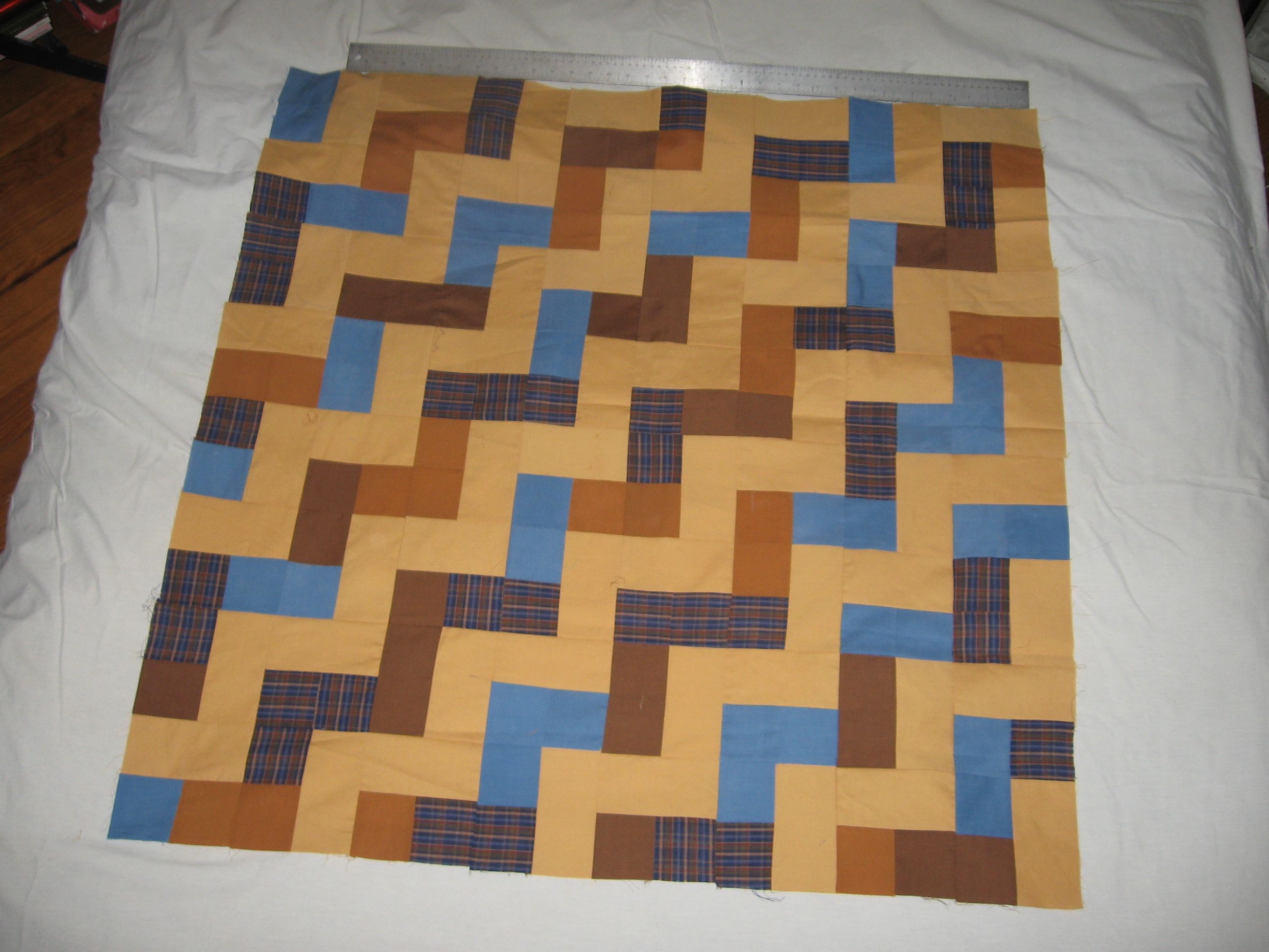 The brown and blue blocks were cut by my mom. The two browns were from my Dad's shirts. Shayne picked out the "butterscotch" color to complement the other colors.
